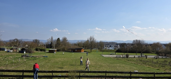 Mit den von uns gestalteten Drachen, ziehen wir dann gemeinsam los und lassen die Drachen, den Himmel über Wolfschlugen erobern.